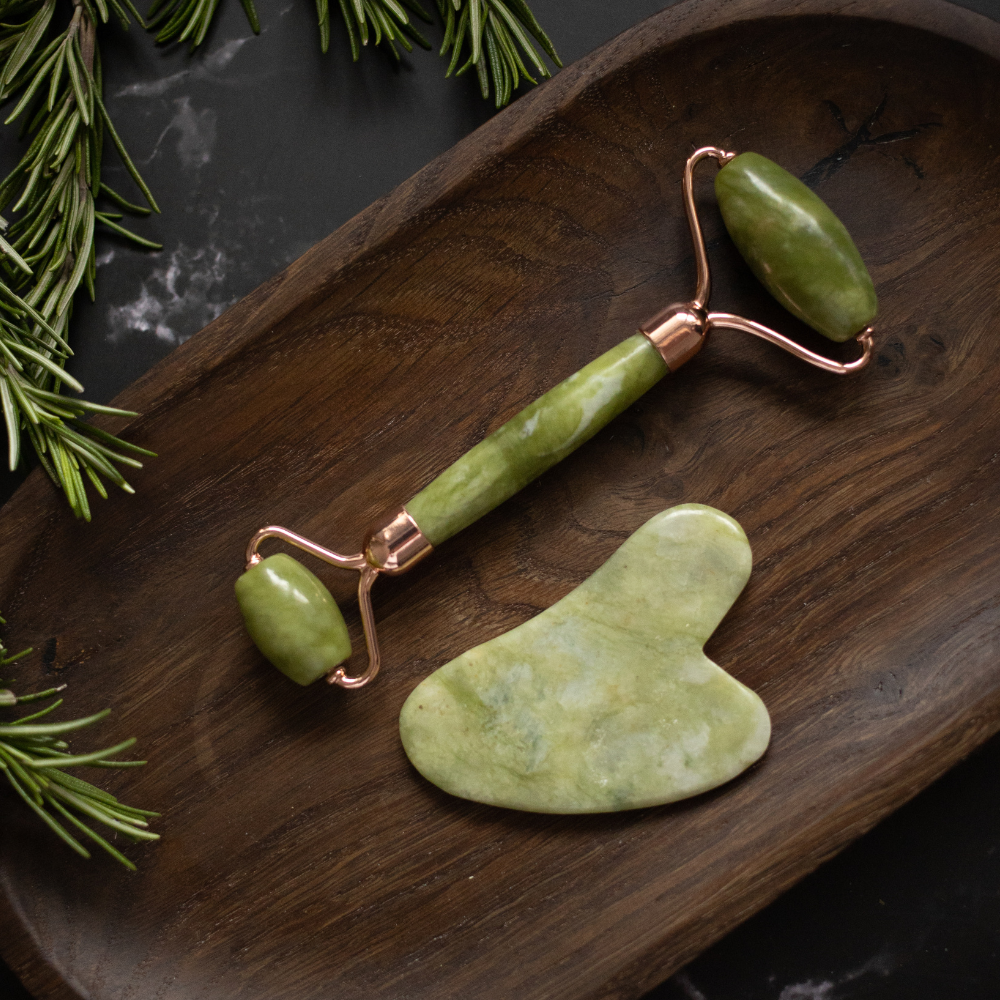 Jadeitowy roller do twarzy oraz kamień Gua-Sha